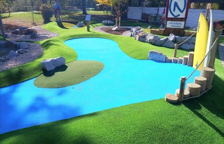 Adventure Golf ist die neue, abenteuerreiche Art Minigolf zu spielen. Vorbei sind die Zeiten, in denen Minigolfanlagen aus grauem Beton ohne Dekoration bestanden. Bei Adventure Minigolfanlagen besteht der Untergrund aus naturechtem Kunstrasen. Dadurch, dass nicht auf herkömmlichen Betonbahnen gespielt wird, ähnelt Adventure Minigolf mehr dem herkömmlichem Golf als Minigolf. Die Bahnen sind dank einer ausgeklügelten Landschaft sehr schön anzusehen. Wir planen und bauen auch für Sie eine Adventure Minigolfanlage.
