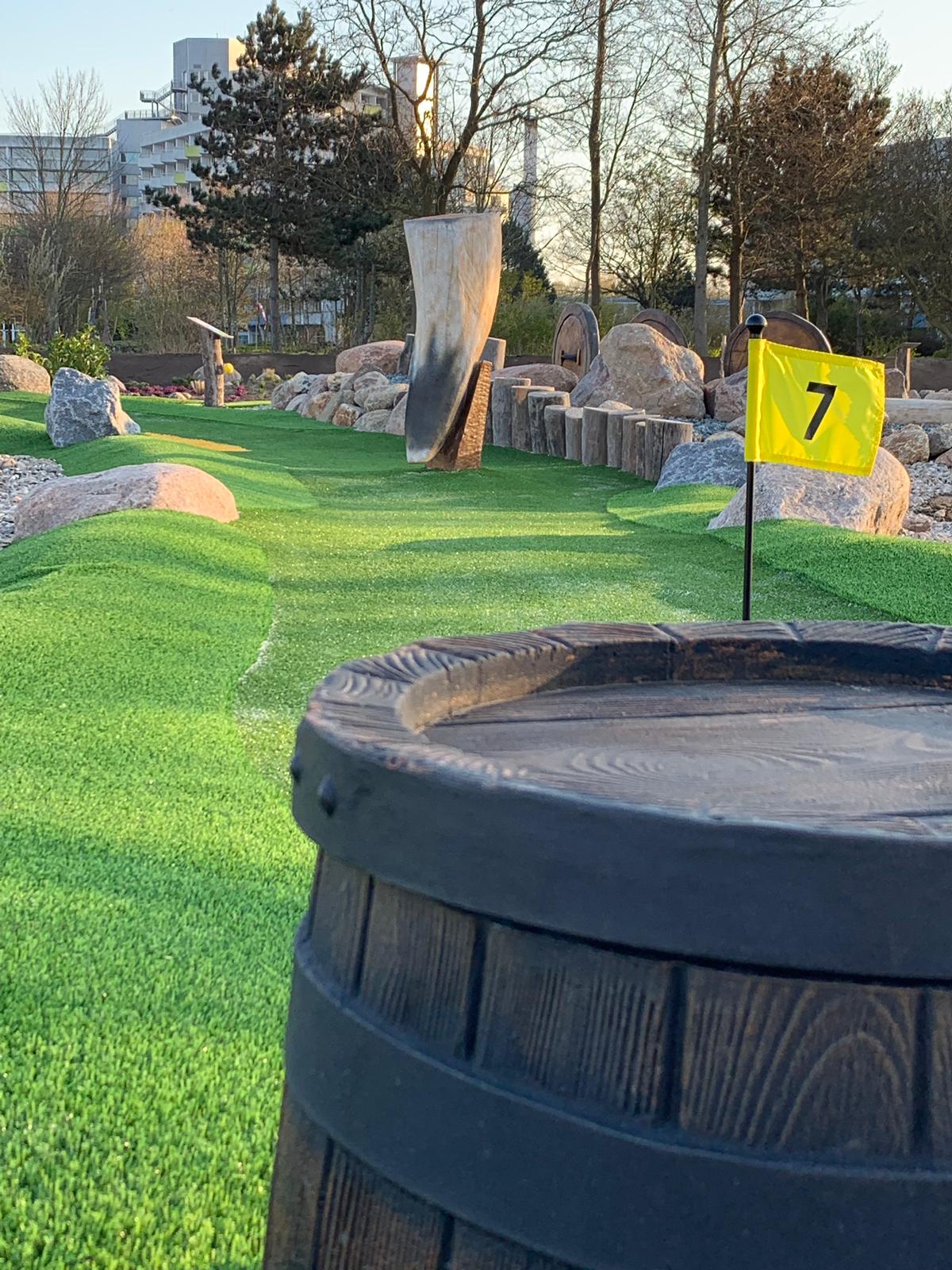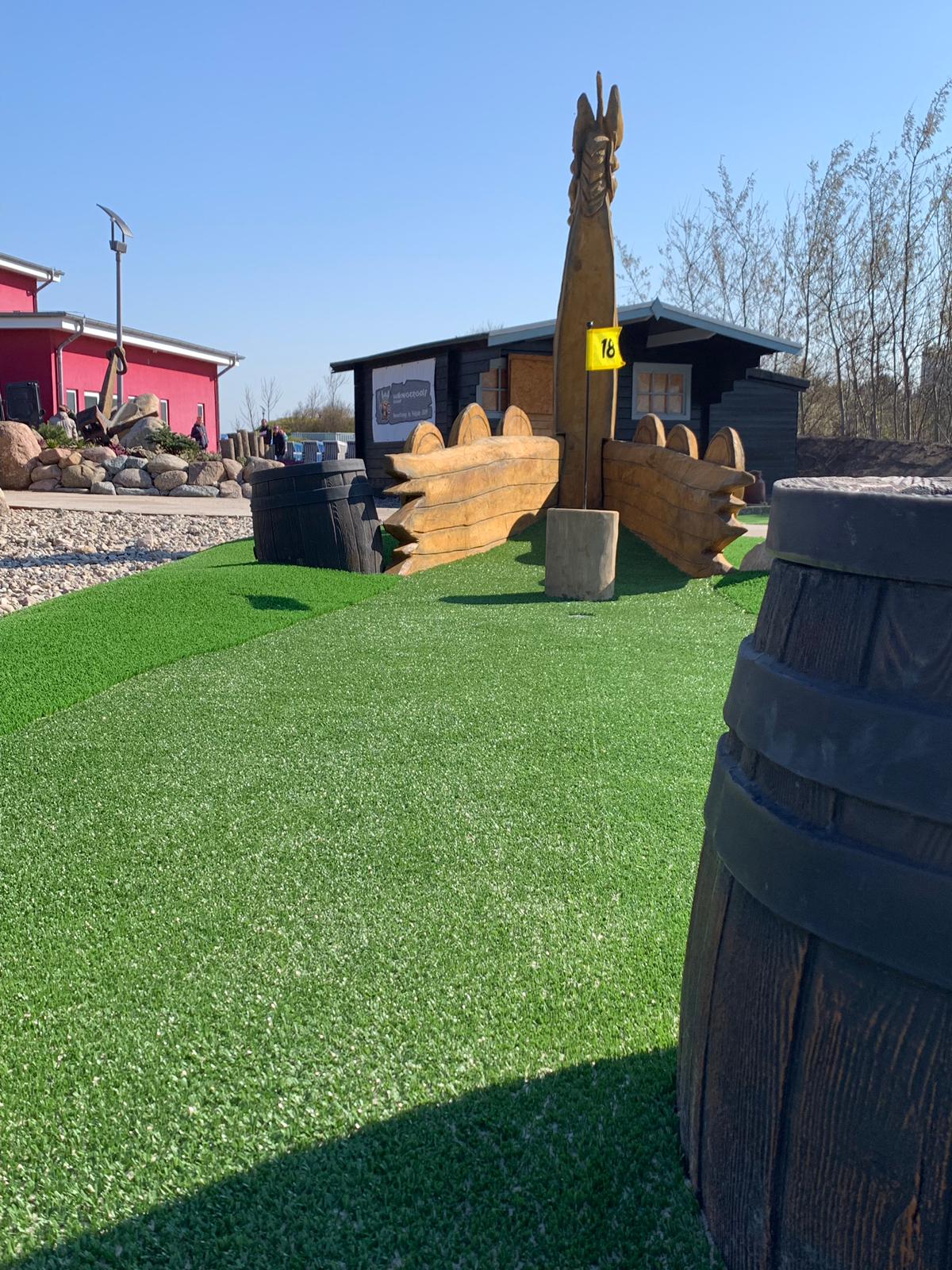 12.04.2019: Nach nur elf Wochen kann man schon das hohe Niveau der Adventure Golfanlage in Damp erkennen. Ein ausgeklügeltes Drainagesystem wurde zunächst im Baugrundplanum fachmännisch eingebracht und aufwendige und anspruchsvolle Bahnen sind fertig modelliert und mit hochwertigem Kunstrasen belegt. Entsprechend dem „Wikinger-Motto“ wurden sehr viel entsplintetes Hartholz, tolle Holzskulpturen und authentische Bauwerke installiert-ein Wikinger Dorf auf 3.000m² ist entstanden. Nur noch wenige Restarbeiten in KW 16 (Wassergebundene Wegedecke im „Biergarten“ und Eingangsportal) und dann können pünktlich zu Ostern die Golfbälle rollen.